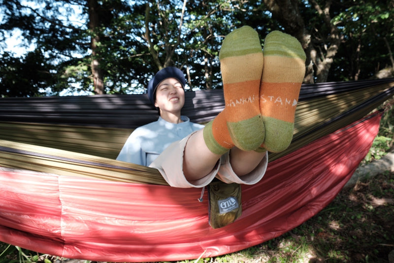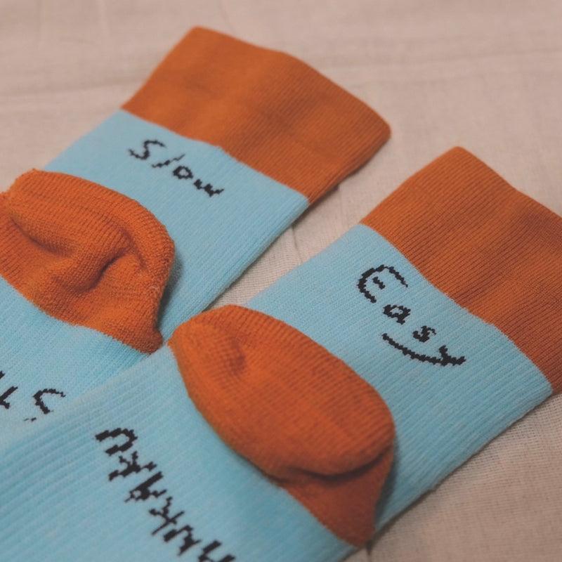 OLENOさんとコラボさせていただいた当店オリジナルデザインのslow & easyソックスにはマイペースに山歩きを楽しんで頂きたいという想いを込めました。